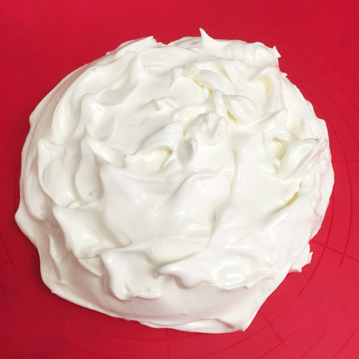 Zuerst das Eiweiss ca. 10 Min zu Eisschnee schlagen (ja, so lange!) dann nach und nach den Zucker dazu geben. Damit die Pavlova von innen die tolle Konsistenz eines Marshmallows kriegt, müsst ihr die Maisstärke und den Essig dazu geben.