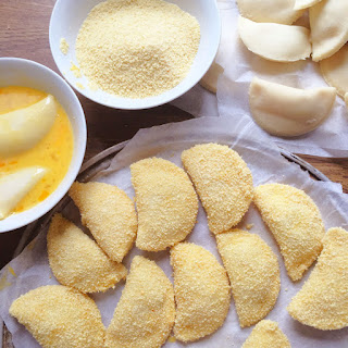 So, jetzt geht’s ans Panieren: zuerst die Teigtaschen in Eier wenden und dann mit Paniermehl bedecken.