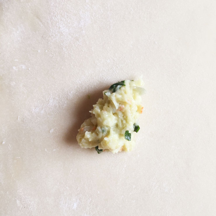 Jetzt ein bisschen Füllung (ideal ist eine Teelöffel-Menge) auf den Teig legen…