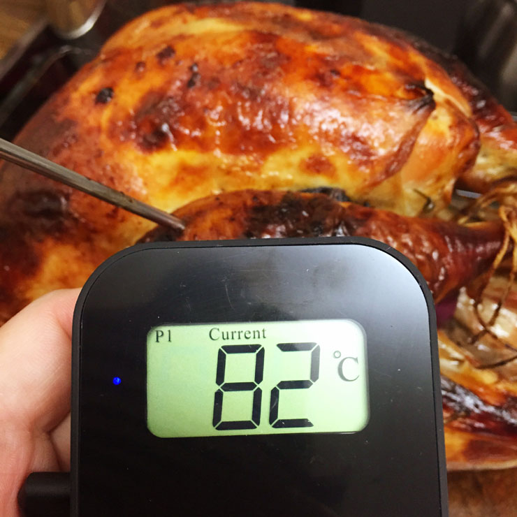 Alle 30 Minuten solltet ihr Brantensaft über den Turkey giessen, damit die Brust nicht austrocknet. Wenn die Kerntemperatur erreicht ist, solltet ihr in die dickste Stelle des Schenkels reinstechen und kontrollieren, ob der Saft der austritt hell ist – dann ist der Turkey durch! Nehmt ihn aus dem Ofen und wickelt ihn in Alufolie ein, damit er so eine halbe Stunde ruhen kann. Dann ist er bereit zum servieren! Bon App und Happy Holidays!