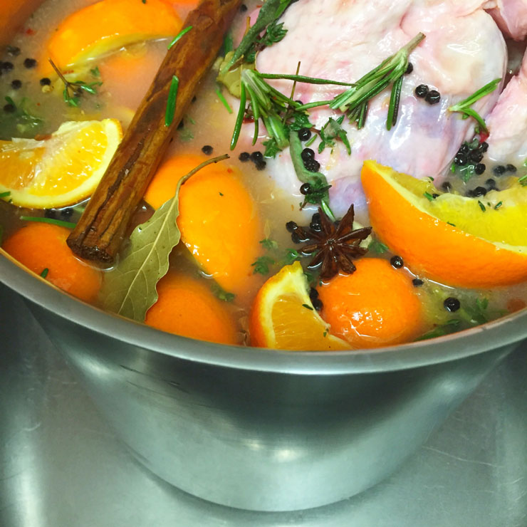 Wir gehen zwei Tage vor Thanksgiving (4. Donnerstag im November) den Turkey kaufen, damit wir ihn einen Tag später für 24 Stunden marinieren können. Damit der Turkey richtig zart und saftig wird, legen wir ihn in eine Gewürzlake (Brine) voller Aromen. Auch hier, es gibt kein „richtiges“ Rezept, seid grosszügig mit den Aromen und Salz – keine Angst, ihr könnt den Vogel nicht versalzen!