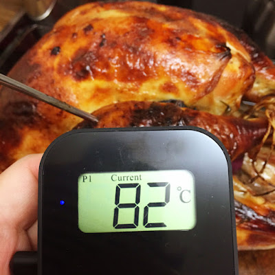 Am Thanksgiving-Nachmittag nehmt ihr den Turkey aus der Brine, trocknet ihn, lasst den Turkey bei Raumtemperatur eine halbe Stunde temperieren. Dann löst ihr vorsichtig die Haut von der Brust (wirklich vorsichtig, damit es kein Loch gibt) und tut etwas weiche Butter (oder Knoblauch-/Kräuter-Butter mit getrockneten Cranberrys wenn ihr das mögt) unter die Haut, damit die Brust noch zarter und geschmackvoller wird. Bindet den Turkey nun mit einer Küchenschnur so, dass die Schenkel schön anliegend sind. Denn wenn der Turkey zart gekocht ist, fängt das Fleisch an sich vom Knochen zu lösen, das sieht dann optisch nicht mehr so schön aus, wenn man den ganzen Turkey am Tisch serviert. Nun ab mit dem Turkey in den vorgeheizten Ofen (170 Grad). Garen bis er eine Kerntemperatur von 80-85 Grad C hat. Dieses Jahr habe ich zum ersten Mal nicht meinen analogen Thermometer benützt, sondern den Bluetooth Thermometer von der Schweizer Fleisch Academy**. Einfach die App „Schweizer Fleisch Academy“ runterladen, Thermometer via Bluetooth mit dem Handy verbinden, gewünschte Kerntemperatur eingeben und die Sonde in das dickte Teil des Geflügels (Schenkel) stecken. Nun könnt ihr laufend auf eurem Handy die aktuelle Kerntemperatur des Turkeys sehen. Wenn die Kerntemperatur erreicht ist, fängt der Thermometer an zu piesen – echt ne tolle Sache, die ich nur weiterempfehlen kann.