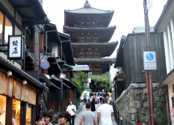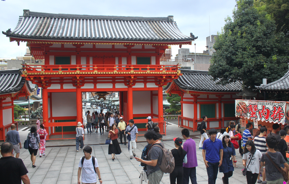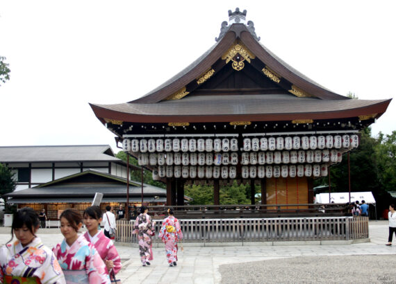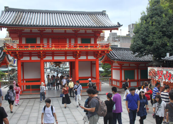 Dieser Schrein ist zentral an der Hauptkreuzung in Gion (dem Geisha-Viertel) gelegen. Er fällt sofort auf, weil das Tor schrill bunt ist. Auf dem Weg zum Schrein gibt es einige Essensstände mit richtig guten lokalen Spezialitäten. Die Anlage ist sehr weitläufig und (verkleidete) Geishas lassen sich hier mit Touristen fotografieren. Ein must-see? Nicht unbedingt, aber der Schrein ist so gut gelegen, dass sich ein Besuch einfach ergibt.