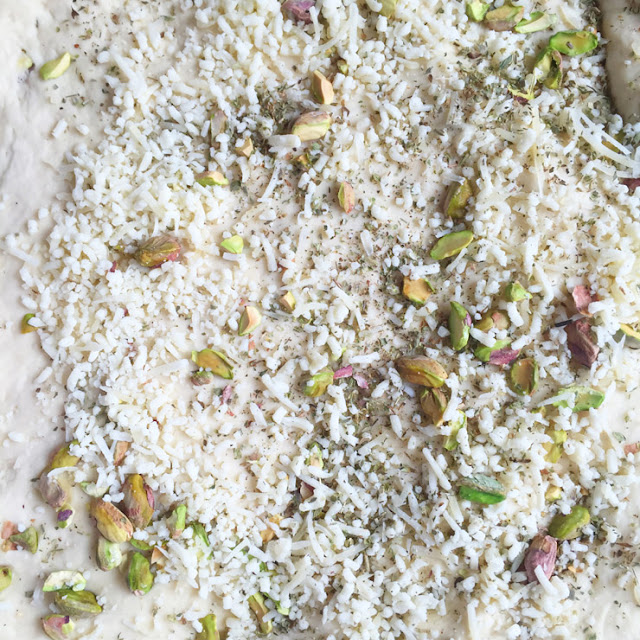 Der Teig sollte nun auf ca. das Doppelte aufgegangen sein. Jetzt den Teig nochmals kneten, etwas auswallen und Käse, Kräuter und Pistazien darüber verteilen.
