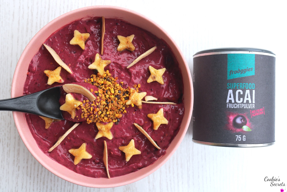 Das erste Mal hörte in der Schweiz von Açai etwa in 2006/2007. Ich weiss das noch so genau, weil ich 2007 in Brasilien war und Açaisaft in einer Strandbar entdeckte. Natürlich musste ich das aus Neugier sofort bestellen – und bereute es sofort! Ich habe selten so etwas „ungutes“ getrunken wie Açaisaft. Deshalb ist dieser Hype um dieses Superfood in den vergangenen Jahren an mir vorbeigegangen. Ich machte nämlich einen grooossen Bogen um Açai 😀 Als ich letzten Herbst in Hawaii war und im Honolulu Café eine Açai-Bowl auf der Karte entdeckte, musste ich dieser Frucht aber wieder eine Chance geben – und oh Wunder, ich war hin und weg! Ich habe leider nicht gefragt, wie sie diese Bowl zubereitet haben oder was genau darin enthalten war 🙁 Darum habe ich mir Frooggies Açai Fruchtpulver gekauft und versucht meine eigene Bowl zu kreieren – sie kommt meiner Hawaii-Erinnerung sehr nahe!