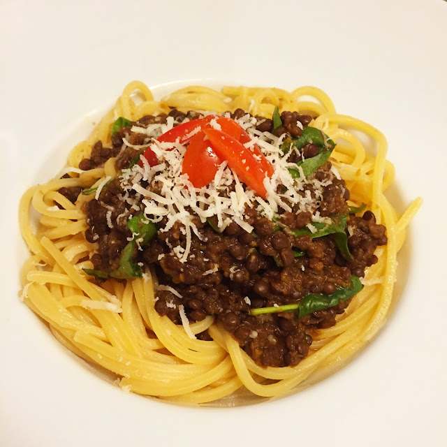 Das Gemüse in kleine Würfel schneiden (dafür habe ich meinen geliebten Food Processor ;-D). Es sieht optisch einfach schöner aus, wenn das Gemüse die gleiche Grösse wie die Linsen hat. Zuerst die Zwiebeln in wenig Öl einige Minuten andünsten, danach das restliche Gemüse und Knoblauch dazu geben und anbraten und anschliessend mit der Tomatensauce ablöschen. Die Linsen mit kaltem Wasser über ein Sieb kurz abspülen und mit in die Pfanne geben sowie ein Lorbeerblatt. Jetzt soviel Wasser dazu geben, dass alles reichlich mit Flüssigkeit gedeckt ist. Nun in der offenen Pfanne vor sich hinköcheln lassen und ab und zu umrühren. Gebt immer wieder Wasser dazu damit die Sauce schön flüssig bleibt. Wichtig: das Gericht erst salzen, oder Brühe dazu geben, wenn die Linsen weichgekocht sind (macht man so bei Hülsenfrüchten). Nach 1 einer Stunde ist die Sauce schön sämig und kann zu der Paste serviert werden. Kurz vor dem Anrichten gebe ich noch frischen Baby-Spinat und klein geschnittene Cherry-Tomaten dazu. Das gibt einen erfrischenden Geschmack. Bon App!